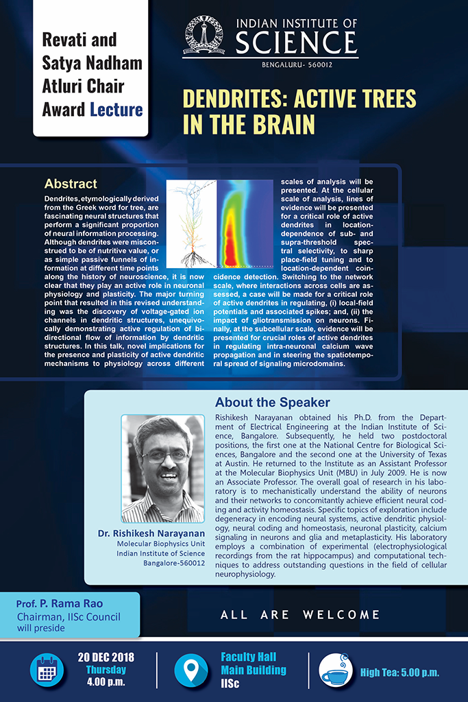 degree from the Institute. April 2017: Abha Jain completed degree requirements for her B.S. degree and joined the lab as a Masters student. March 2017: Anindita Das presented her research work at the Gordon Research Conference on Dendrites: Molecules, Structure & Function held at Lucca (Barga), Italy. January 2017: Reshma Basak attended the IBRO-SIMONS Computational Neuroscience Imbizo held at Cape Town, South Africa. December 2016: Manisha Sinha's research and laboratory highlighted in IISc's annual magazine Kernel 2015-2016. [PDF of the article] December 2016: Rishi presented research work from the lab in the joint Israel-India Neuroscience symposium held at Eilat, Israel. December 2016: Lab selected for receiving Senior fellowship from the Wellcome Trust-DBT India Alliance. November 2016: Manisha Sinha successfully defended her PhD thesis. November 2016: Sufyan Ashhad and Poonam Mishra presented their respective research work from the lab at the Society for Neuroscience Annual Meeting, San Diego, CA, USA. September 2016: Rishi was awarded the Shanti Swarup Bhatnagar Prize in Biological Sciences (Picture from the Feb 2019 award ceremony). August 2016: Neha Soman joined the lab as a research trainee. August 2016: Manisha Sinha submitted her PhD thesis. August 2016: Chinmayee Mukunda moved to the National Centre for Biological Sciences, Bangalore, as a PhD student. July 2016: Sufyan Ashhad moved to Prof. Jack Feldman's laboratory in the University of Califonia at Los Angeles, USA, as a Postdoctoral fellow. June 2016: Rishi presented research work from the lab in the EMBO Workshop on Dendritic Anatomy, Molecules and Function held at the Foundation for Research and Technology - Hellas (FORTH), Heraklion, Greece. June 2016: Poonam Mishra attended the Neural Systems and Behavior course at the Marine Biological Laboratory, Woods Hole, USA. June 2016: Rahul Rathour received the Prof BH Iyer medal (2014-2015) for the best PhD thesis in the Molecular Biophysics Unit, IISc.