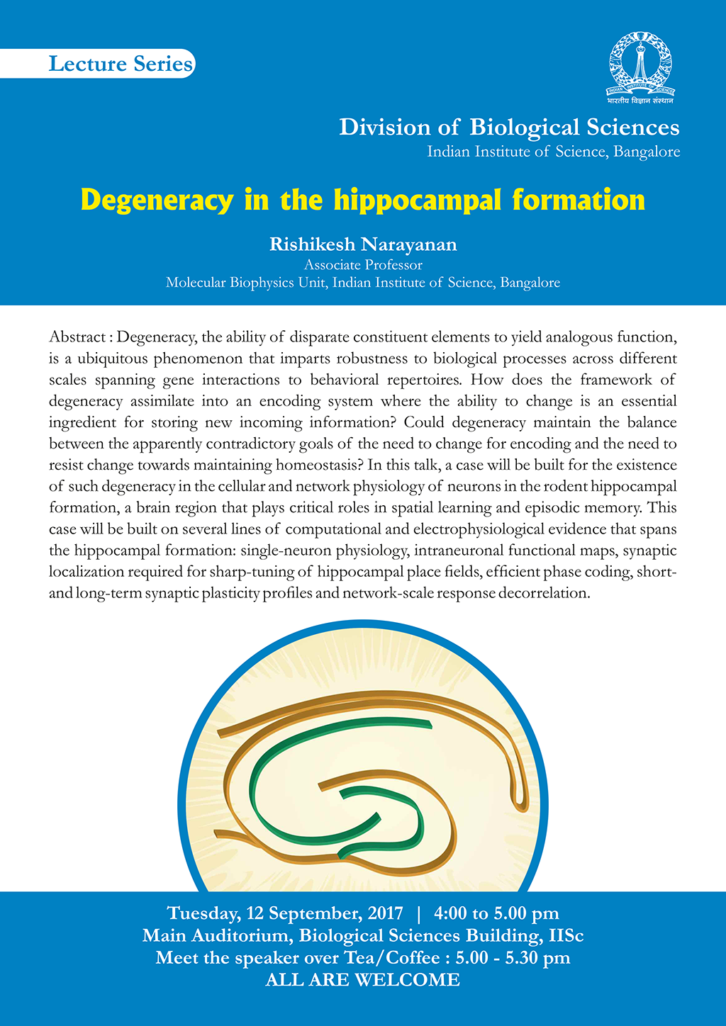 September 2021: Sameera Shridhar moved to the University of Chicago, USA, as a PhD student. July 2021: Poonam Mishra presented her research from the lab at the 44th Annual Meeting of the Japan Neuroscience Society in a symposium on "Unique coding in the self-replenishing memory circuit: The dentate gyrus". July 2021: Minnal Balaji joined the laboratory to do her B.S. final year project. July 2021: Sarang Saini joined the laboratory as an integrated PhD student. July 2021: Pavithraa Seenivasan successfully defended her PhD thesis. July 2021: Harshith Nagaraj completed degree requirements for his B.S. degree and joined the laboratory as a Masters student. June 2021: Rishi presented work from the laboratory at the 32nd mid year meeting of the Indian Academy of Sciences, Bangalore. May 2021: Laboratory featured in IISc's research newsletter Kernel, May 2021. [PDF of the article] December 2020: Pavithraa Seenivasan submitted her Ph.D. thesis. November 2020: Reshma Basak moved to Dr. Hema Somanathan's laboratory in IISER Tiruvananthapuram, as a Postdoctoral fellow. October 2020: Anjana S joined the laboratory as a Ph.D. student under the newly formed Brain & Artificial Intelligence interdisciplinary Ph.D. program. August 2020: Poonam Mishra moved to Dr. Vatsala Thirumlai's laboratory in National Centre for Biological Sciences, Bangalore, as a Postdoctoral fellow. May 2020: Sanjna Kumari joined the laboratory as an integrated Ph.D. student. March 2020: Harshith Nagaraj joined the laboratory to do his B.S. final year project. February 2020: Divyansh Mittal presented his research from the lab at the Computational and Systems Neuroscience Conference (COSYNE 2020) held at Denver, USA. February 2020: Reshma Basak successfully defended her PhD thesis. January 2020: Rishi presented work from the laboratory at the at the National Centre for Biological Sciences, Bangalore as part of NCBS Annual Talks 2020. January 2020: Rishi was elected as a Fellow of the Indian Academy of Sciences, Bangalore. December 2019: Poonam Mishra successfully defended her PhD thesis. October 2019: Rishi presented work from the laboratory at the Jawaharlal Nehru Centre for Advanced Scientific Research, Bangalore. October 2019: Reshma Basak presented her research from the lab at the 18th Annual Molecular and Cellular Cognition Society meeting in Chicago, IL, USA and in the Society for Neuroscience Annual Meeting, Chicago, IL, USA. September 2019: Poonam Mishra presented her research from the lab at the 10th IBRO World Congress, Daegu, Republic of Korea. September 2019: Rishi presented research work from the lab at the 10th IBRO World Congress, Daegu, Republic of Korea. September 2019: Anindita Das received the Prof BH Iyer medal (2017-2018) for the best PhD thesis in the Molecular Biophysics Unit, IISc. August 2019: Rishi presented research work from the lab at the NeuroAI symposium, Bangalore. August 2019: Arunima Banerjee moved to the Johns Hopkins University, Baltimore, USA, as a PhD student. August 2019: Richa Sirmaur joined the laboratory as a Ph.D. student. August 2019: Sameera Shridhar joined the laboratory as a research trainee. July 2019: Poonam Mishra submitted her Ph.D. thesis. July 2019: Reshma Basak submitted her Ph.D. thesis. February 2019: Pavithraa Seenivasan presented her research from the lab at the Computational and Systems Neuroscience Conference (COSYNE 2019) held at Lisbon, Portugal. February 2019: Rishi presented research work from the lab as part of the Indo-French scientific and training workshop organized by and held at Université Côte d'Azur, Nice, France. January 2019: Ankit Roy joined the lab to do his BS final year project. December 2018: Rishi presented research work